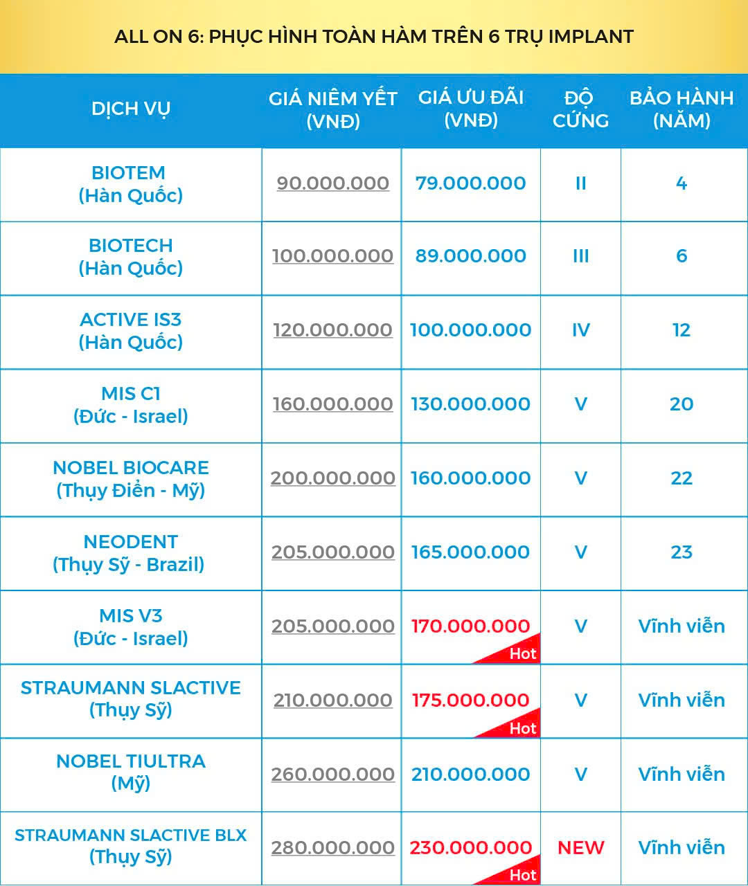 (Giá trọn gói đã bao gồm 6 Implant + 6 Multi Abutment và 14 Răng Toàn Sứ)