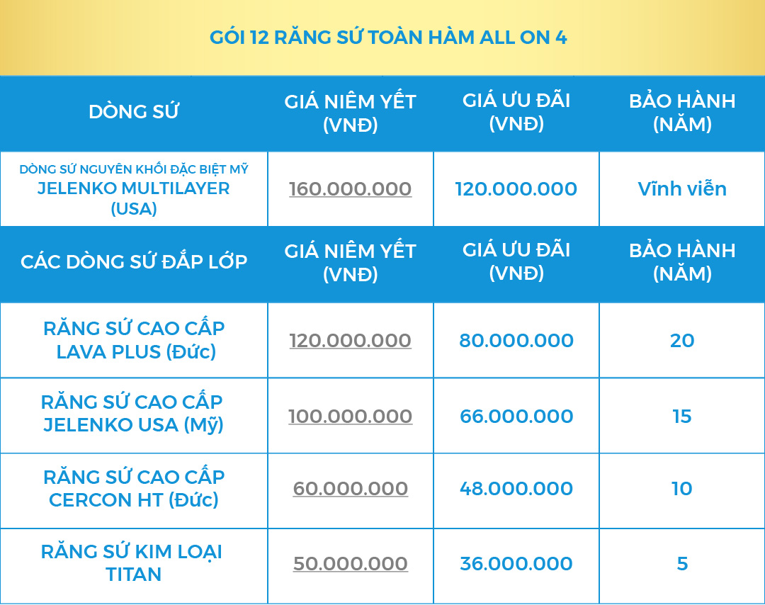 (Giá trọn gói đã bao gồm 4 Implant + 4 Multi Abutment và 12 Răng Toàn Sứ)