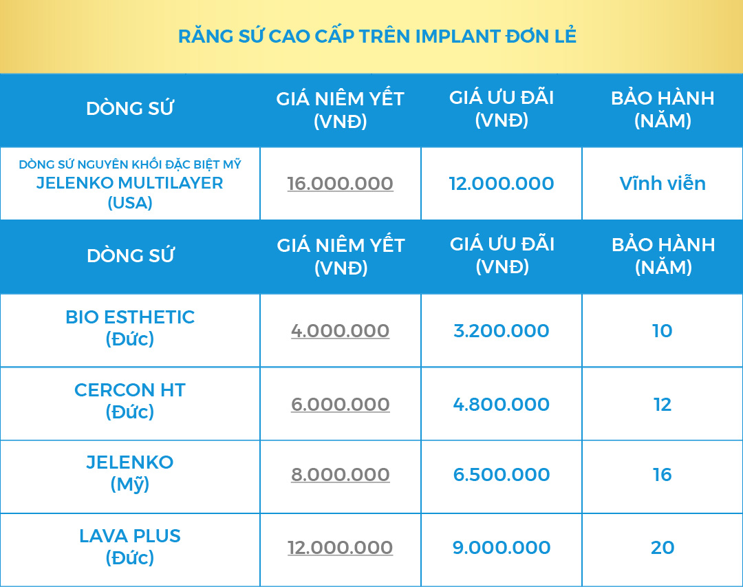 2. Bảng giá trụ Implant đơn & răng sứ trên trụ