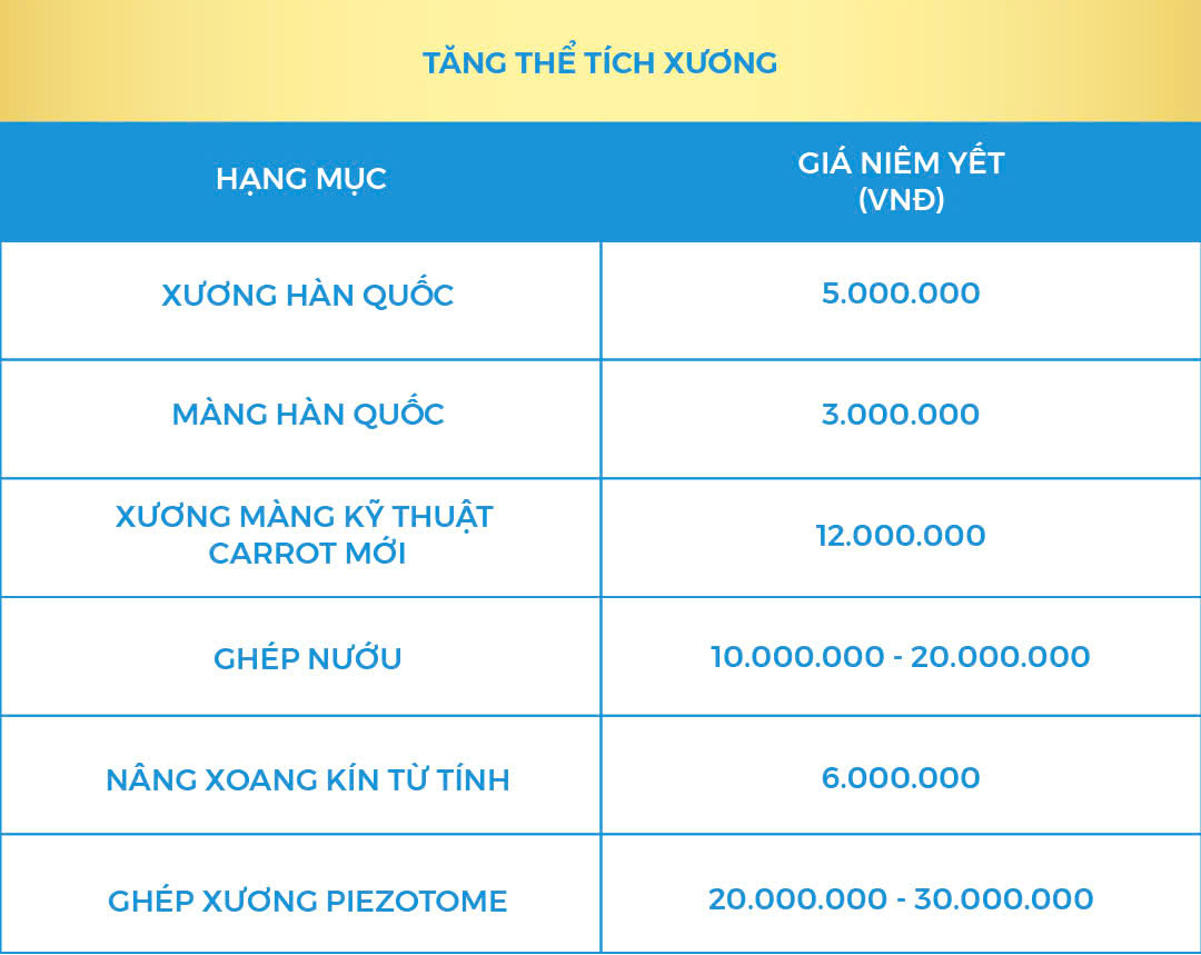 4. Bảng giá tăng thể tích xương mới nhất