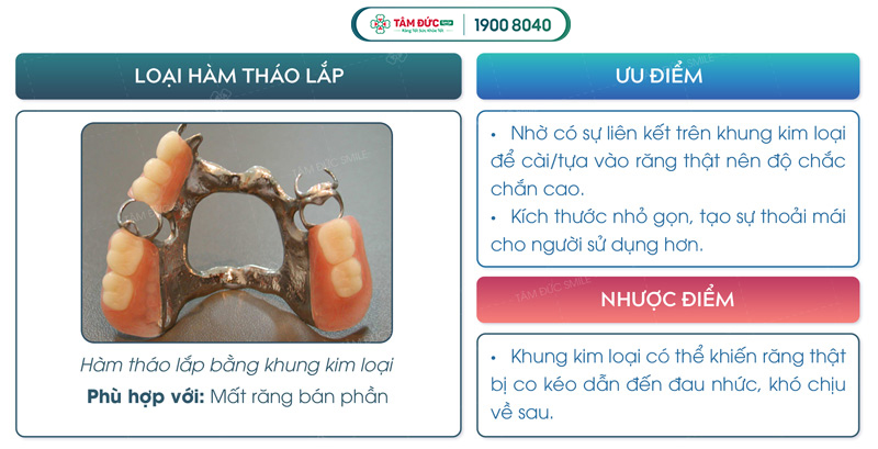 - Hàm giả tháo lắp bằng khung kim loại: Dùng cho những trường hợp mất răng bán phần.