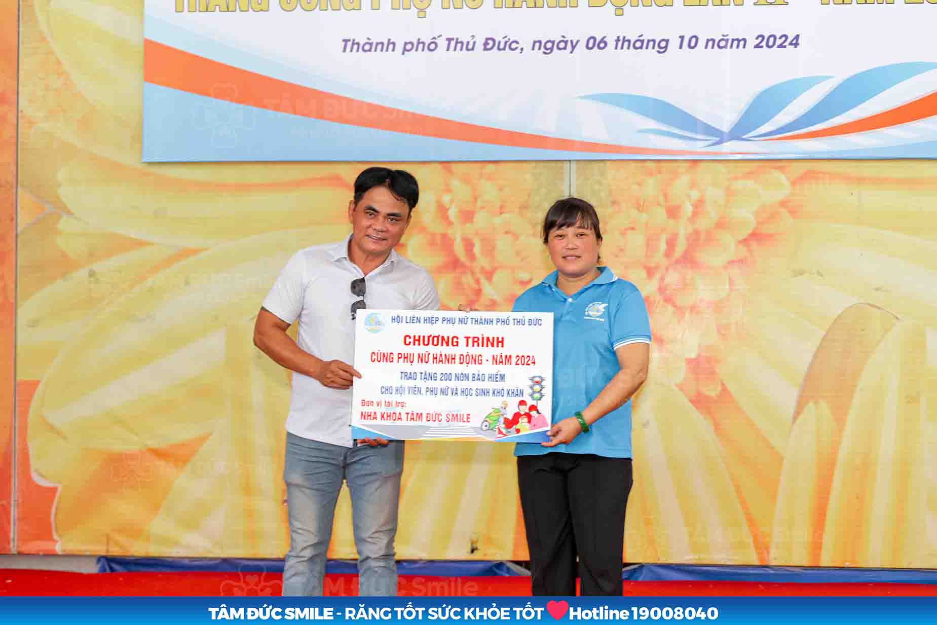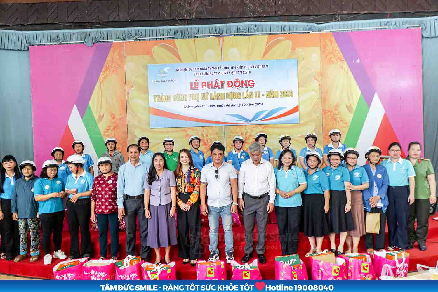 Ngày 06/10/2024 vừa qua, nha khoa Tâm Đức Smile đã có mặt tại buổi lễ phát động “Tháng cùng Phụ nữ hành động” lần II - năm 2024 được tổ chức ở Thành phố Thủ Đức. Đây là chương trình của Hội Liên Hiệp Phụ Nữ Thành phố Thủ Đức với nhiều hoạt động ý nghĩa, thiết thực dành cho cộng đồng.